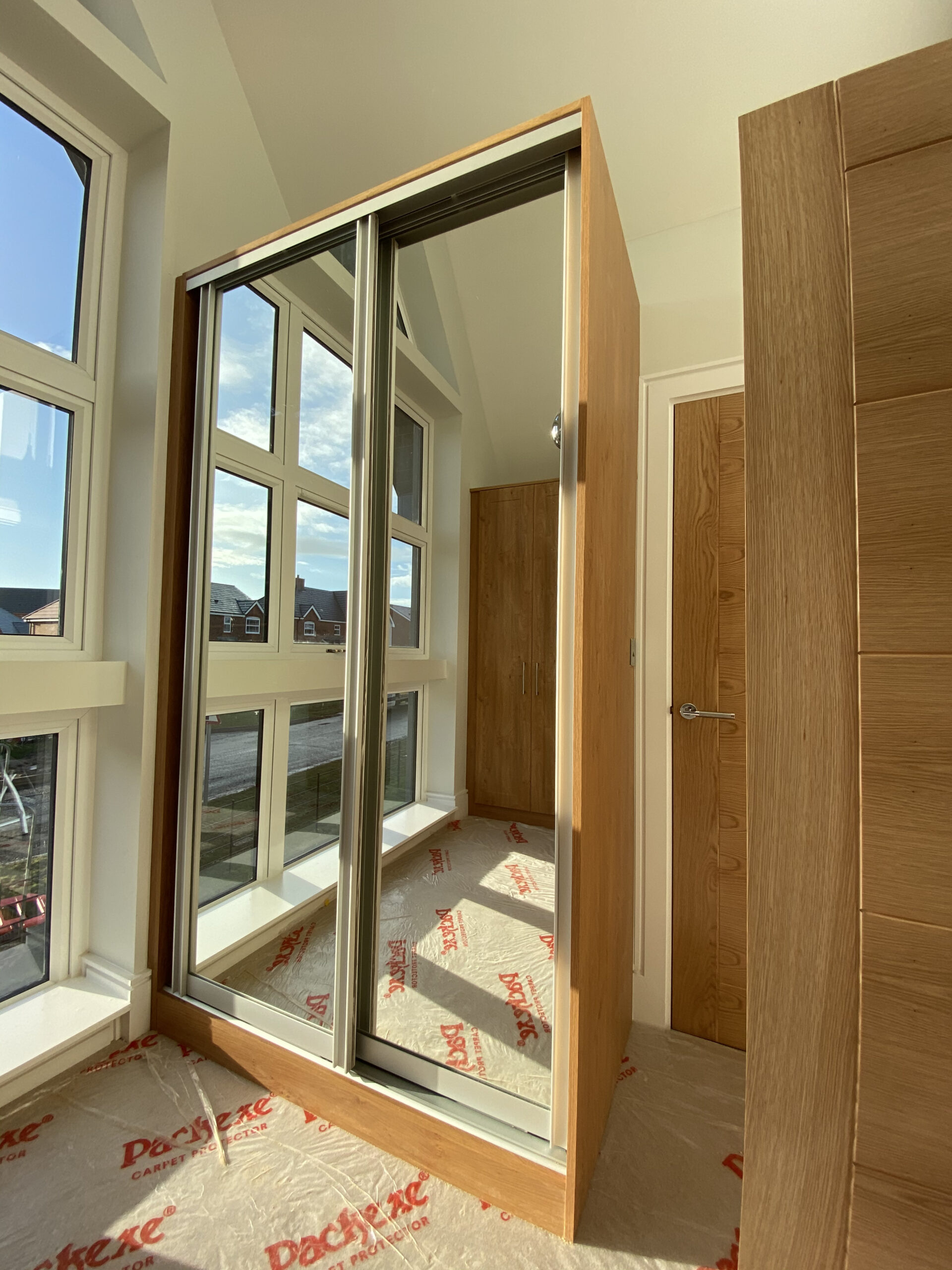 For continuity the dressing room was also designed and fitted in oak laminate with sliding mirror door wardrobes maximising both the floor space and light in this smaller room.