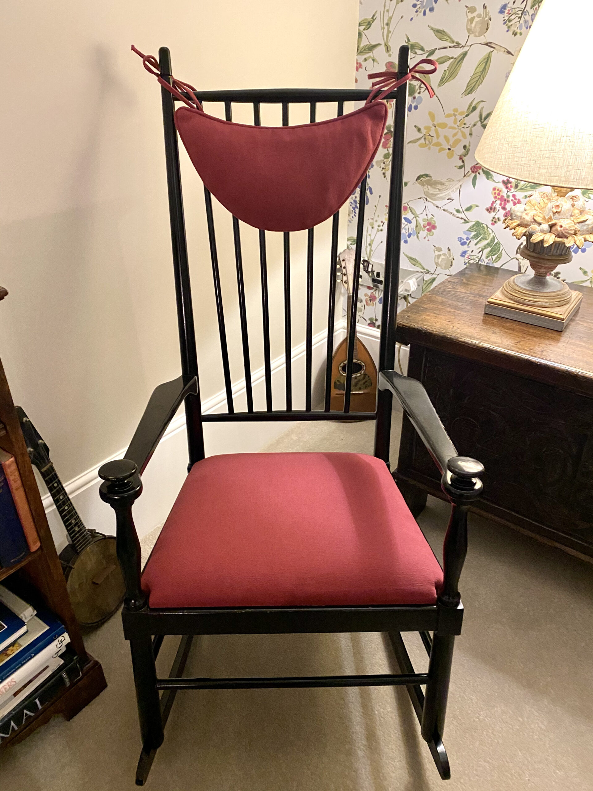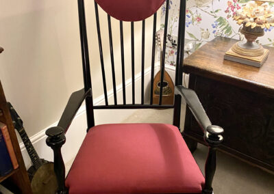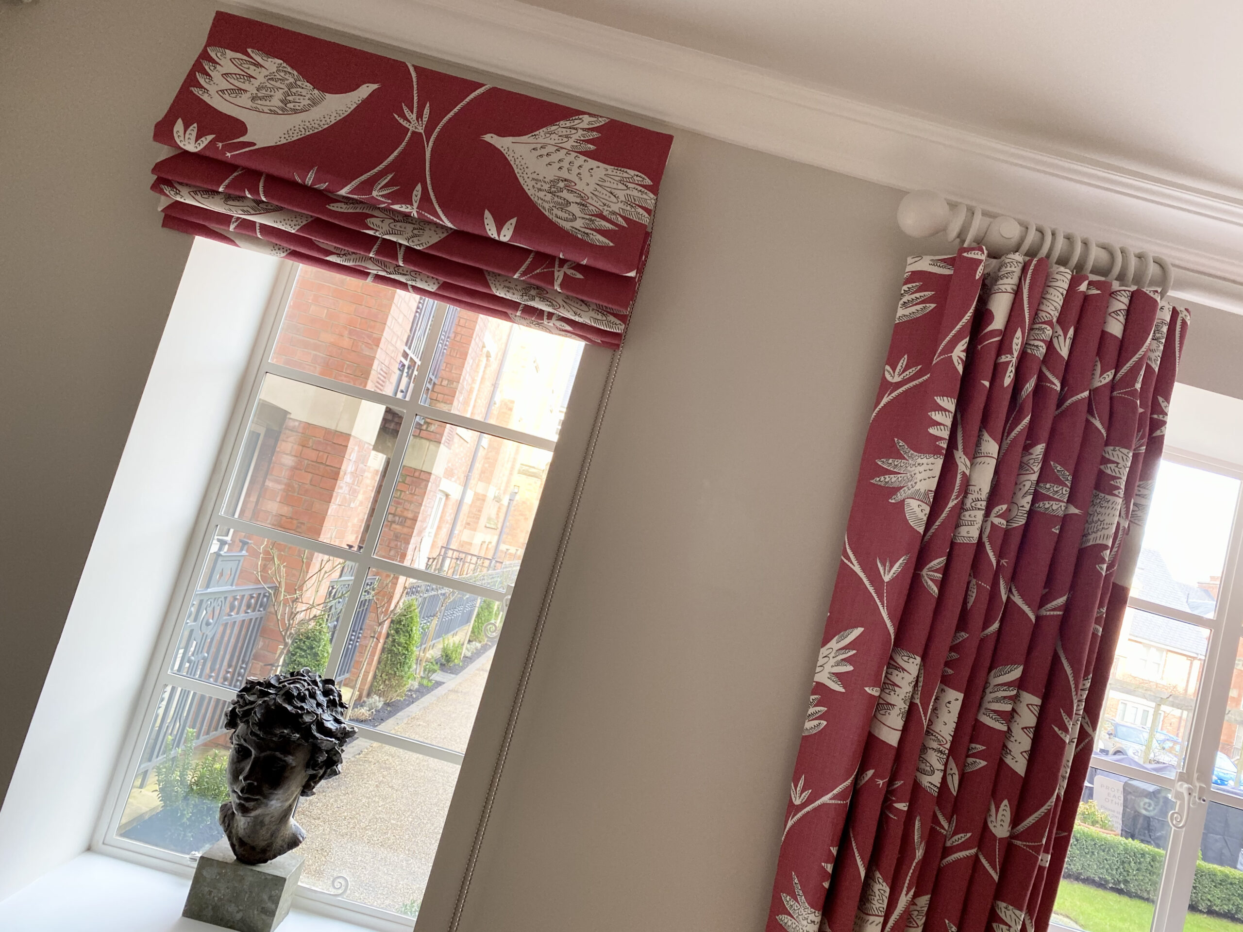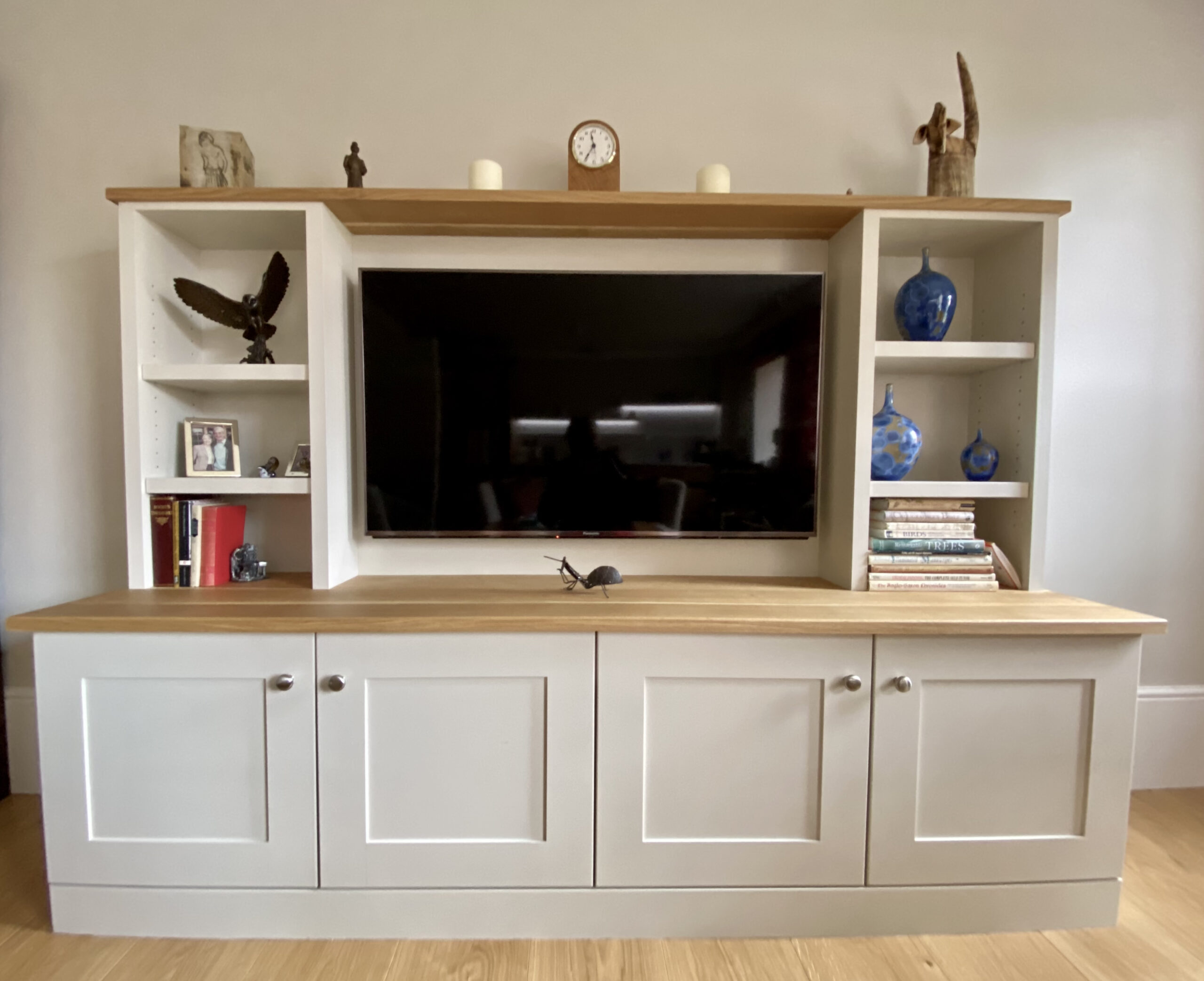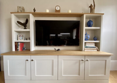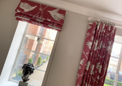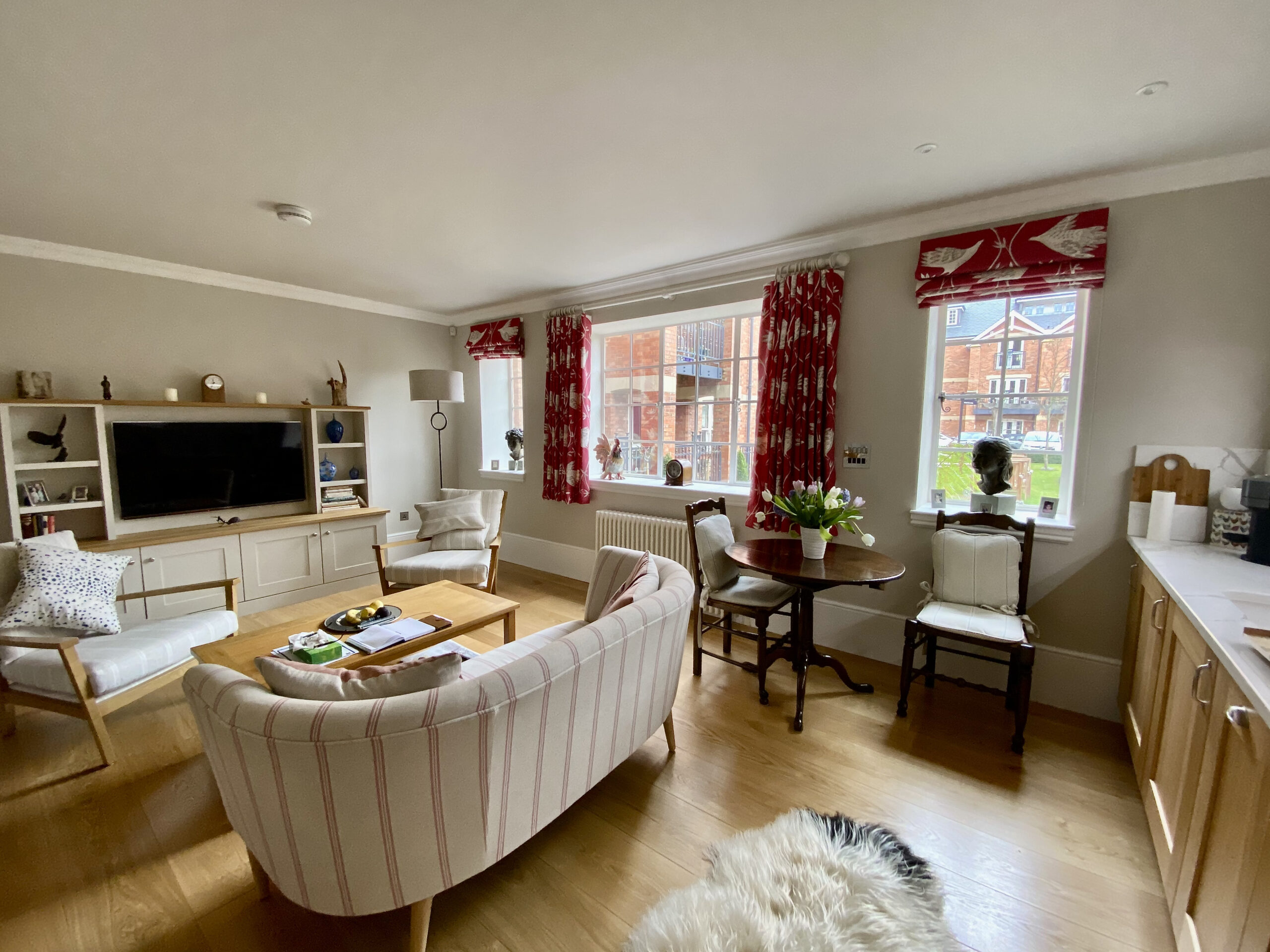 The transformation from a small galley kitchen with one window, to a bright integrated room with three windows, which we dressed for her, using Vanessa Arbouthnott ‘In Full Flight’ fabric lined with Stockholm Stripe, which looked stunning from inside and out! The client opted for barrel headings for the curtains and the walls were painted with Little Greene Paint colour Joanna 130, which was also used for the matching hand painted curtain pole. We also designed and installed a hand painted media unit finished with solid oak tops to compliment the new oak flooring.