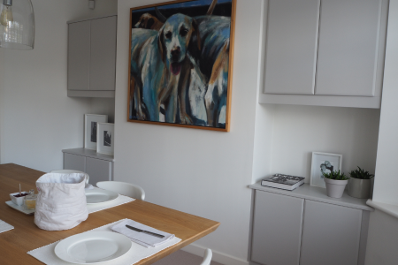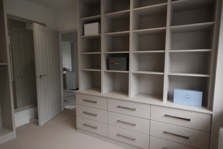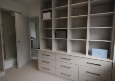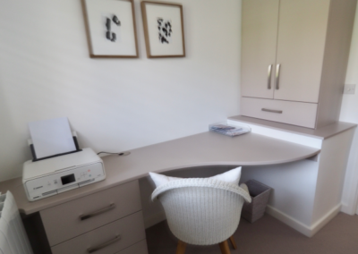 Upstairs we installed a walk-in closet for Mrs B and fitted wardrobes and drawer sets in further bedrooms. The smallest room made a perfect study, we even installed some units in the bathroom. To compliment the shutters, Irene suggested wooden painted Venetian blinds throughout the other rooms which completed the Skandi feel throughout.