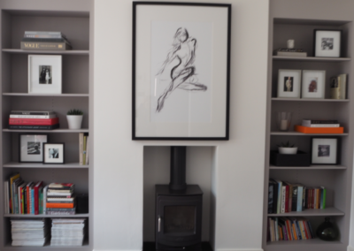 Stan designed lounge units and shelves either side of the chimney breast and cupboards in both the dining room and living area. Our plantation shutters in the bay window of the dining room complimented the Vincent Sheppard Albert dining table with the white base and the Teo oak chairs, simple yet stunning.